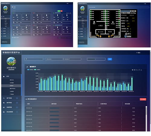 系统提供丰富的数据查询页面,能实时查询前端现场大屏当前显示内容(延迟2-3秒),随时了解厕所使用的状态和各种参数,能查询各种指标的历史数据(男女客流数据、卫生评价数据、环境数值等等)