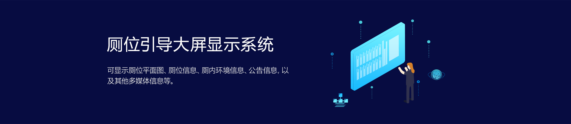 厕位引导大屏可动态显示厕位平面图、厕位占用信息、厕内环境信息、公告信息,以及其他多媒体信息等。